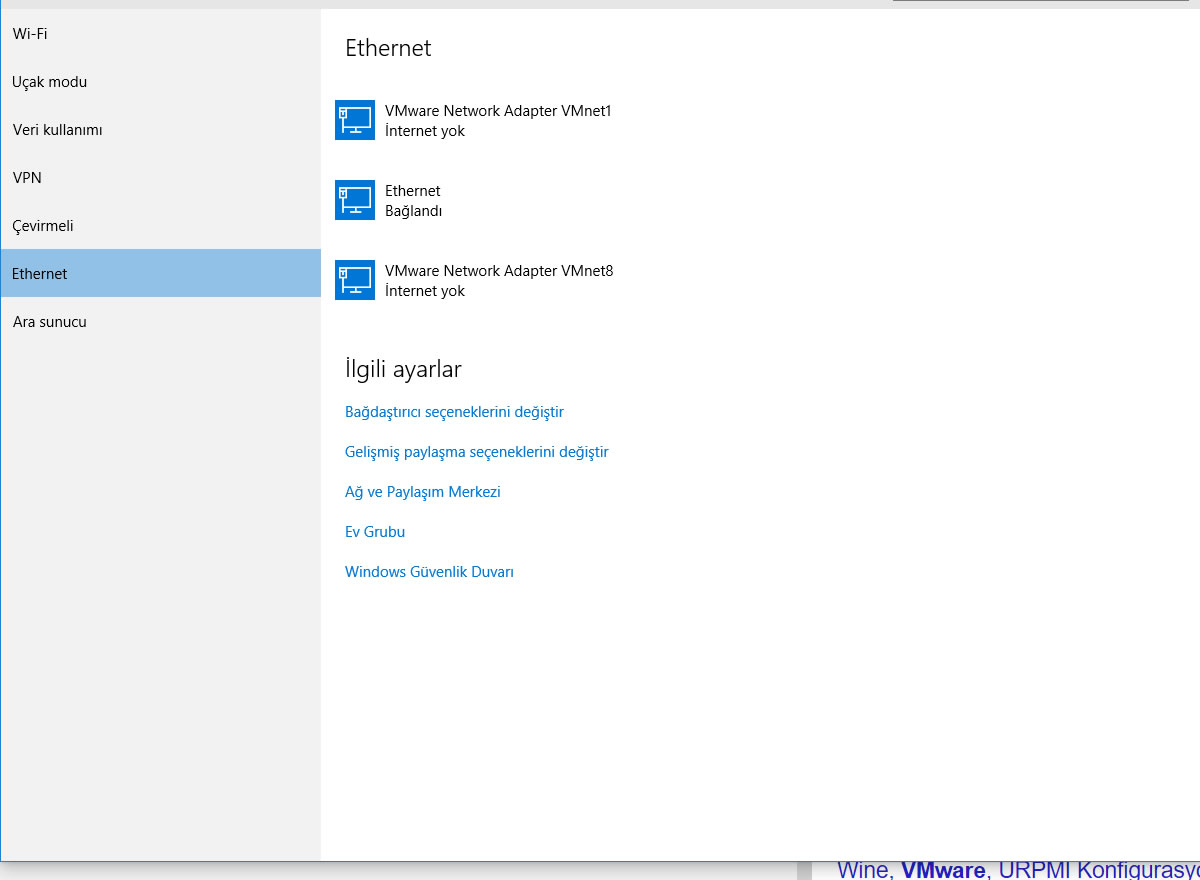 Vmware kurulumu tamamlandı anladım. Orada sanal switchler var. Kendi kurmuş ya da sizin sanal makine açarken kurduğu olabilir. Sorun ne şu anda?